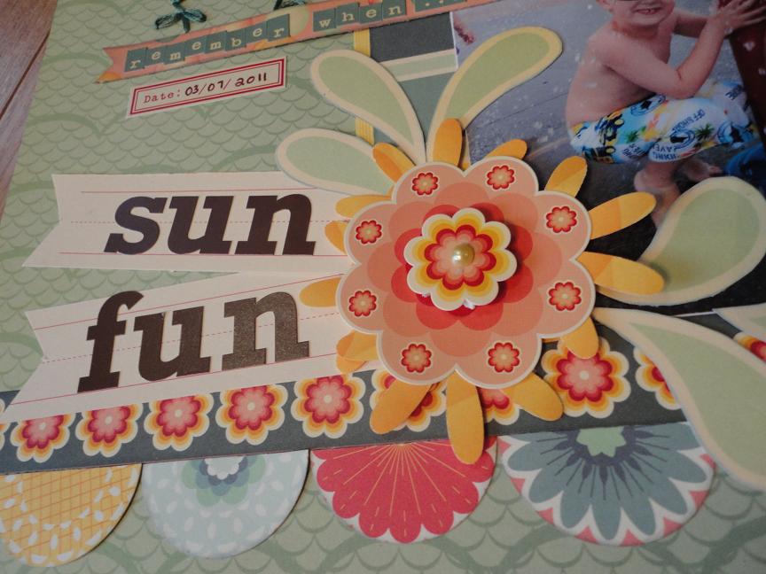 Instead of including a smaller picture like the sketch suggested, I added a large flower embellishment made form layered stickers and some "splashing" leaves.